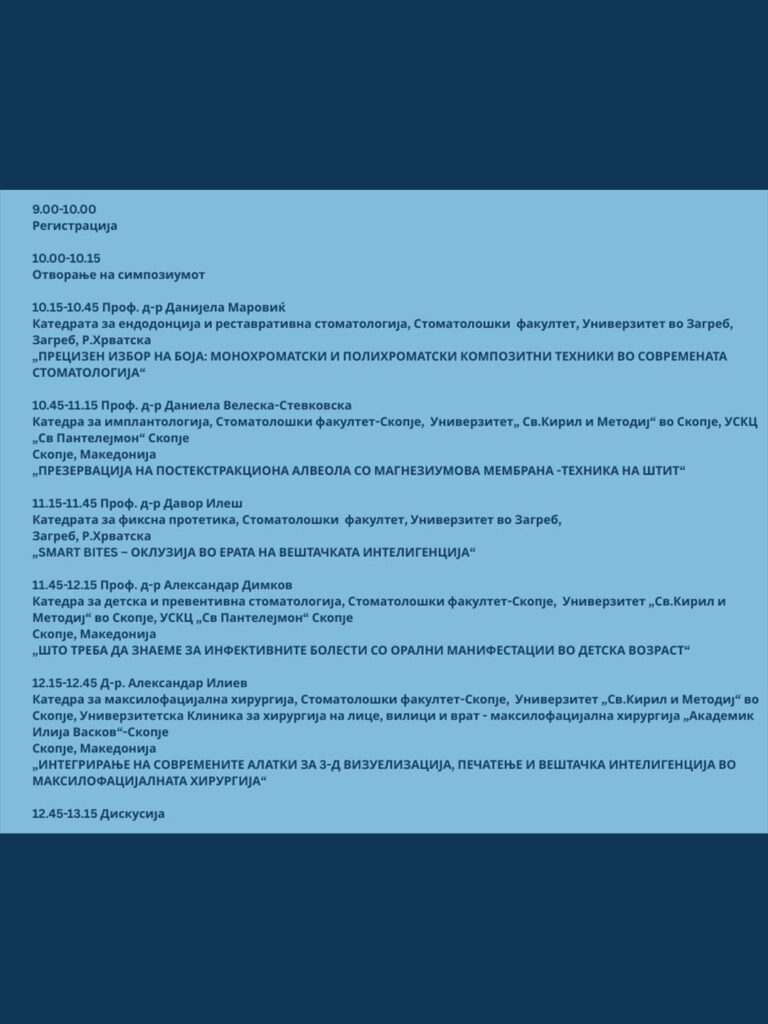 На 7.3.2026 (сабота), со почеток од 10 часот, во амфитеатарот бр. 1 на Стоматолошкиот факултет – Скопје, ќе се одржи симпозиумот со наслов: ”МЕТОДИ И ТЕХНОЛОГИИ ВО СОВРЕМЕНАТА СТОМАТОЛОГИЈАТА”.