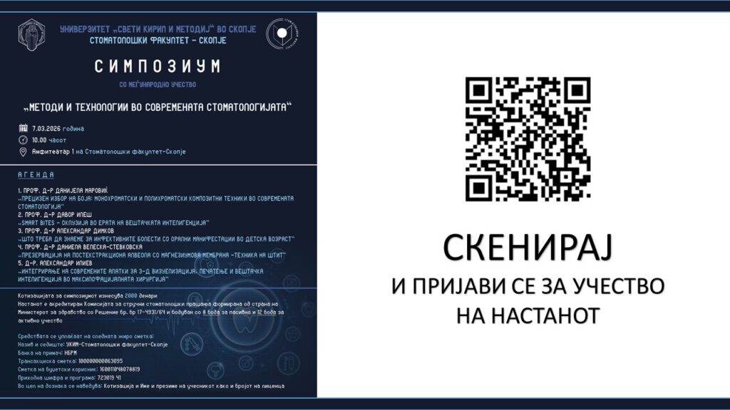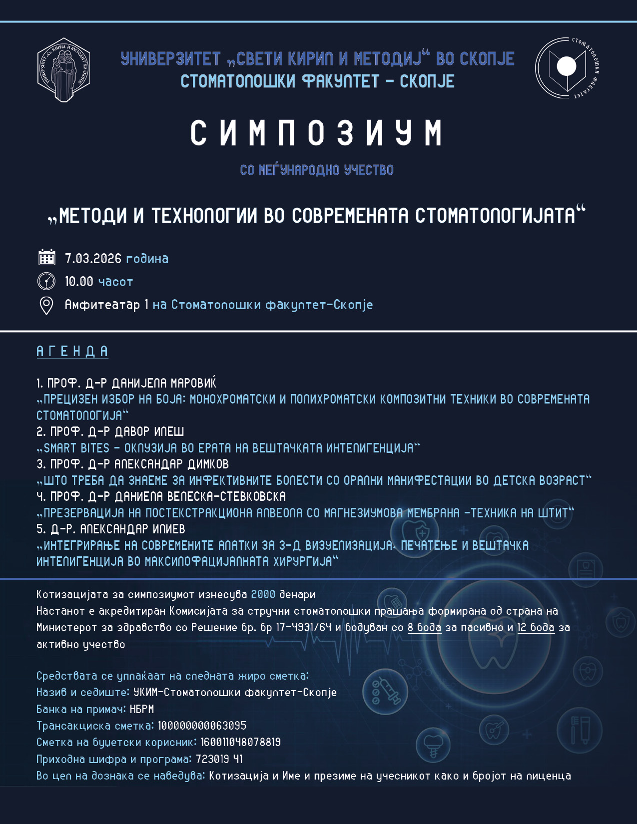 👉На 7.3.2026 (сабота), со почеток од 10 часот, во амфитеатарот бр. 1 на Стоматолошкиот факултет – Скопје, ќе се одржи симпозиумот со наслов: ”МЕТОДИ И ТЕХНОЛОГИИ ВО СОВРЕМЕНАТА СТОМАТОЛОГИЈАТА”.