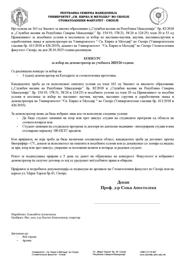 КОНКУРС за избор на демонстратор во учебната 2025/26 година