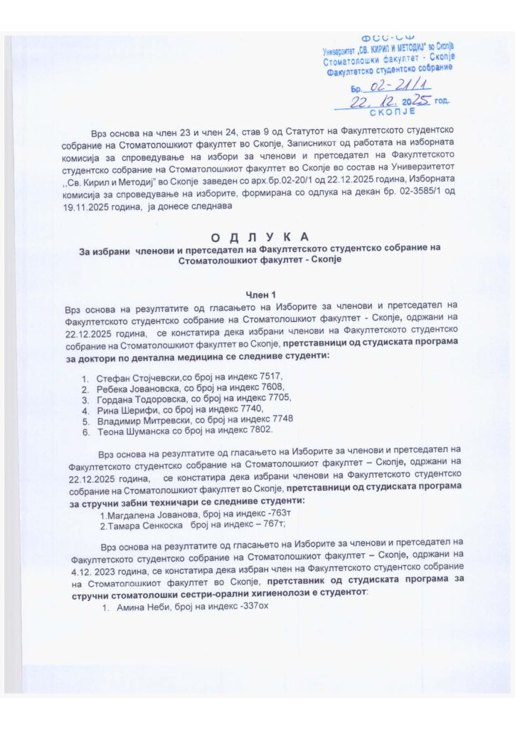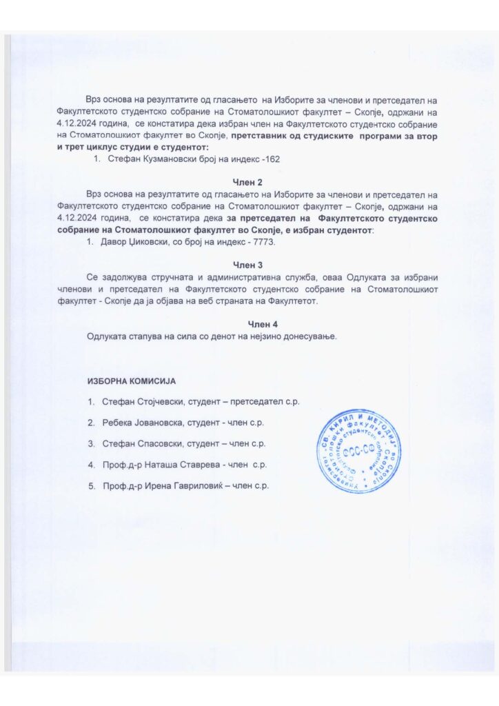 Одлука за избрани членови и претседател на Факултетското студентско собрание на Стоматолошки факултет-Скопје