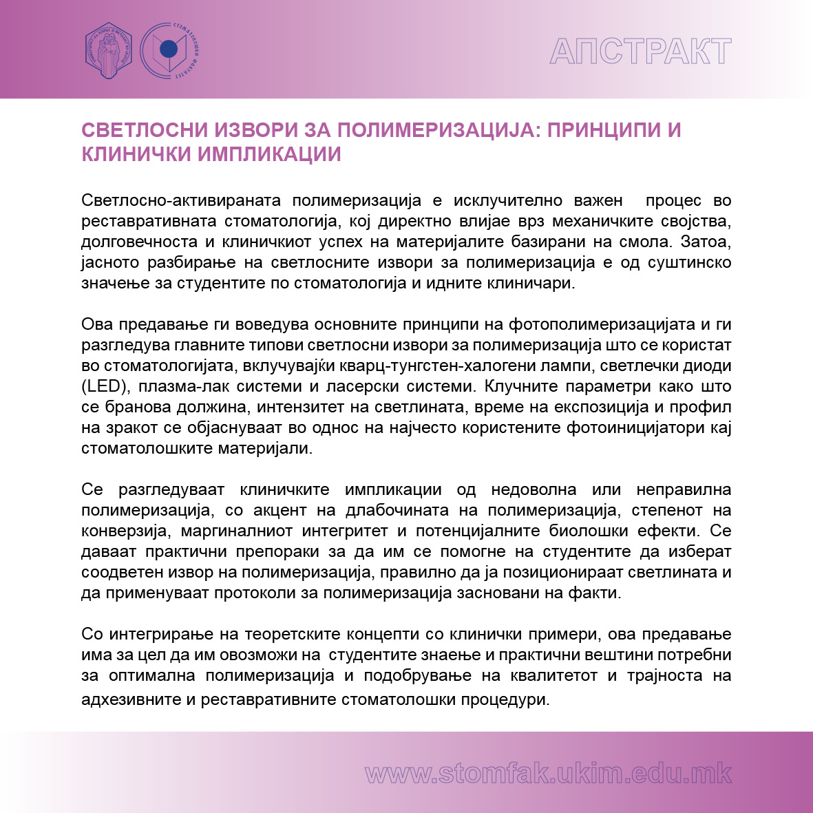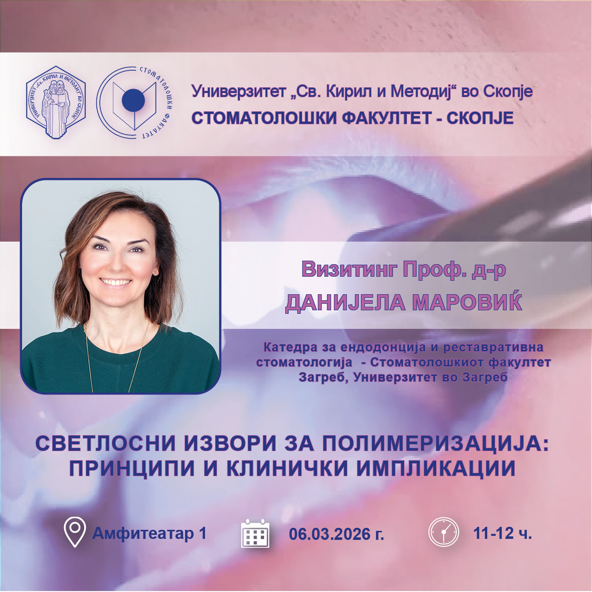 ⚜️Стоматолошки факултет – Скопје, Универзитет ,,Св. Кирил и Методиј’’ во Скопје на 06.03.2026 година, со почеток од 11 часот, во Амфитеатар 1, организира стручно предавање со наслов „СВЕТЛОСНИ ИЗВОРИ ЗА ПОЛИМЕРИЗАЦИЈА: ПРИНЦИПИ И КЛИНИЧКИ ИМПЛИКАЦИИ“, кое ќе го одржи Визитинг Проф. д-р Данијела Маровиќ, од Катедрата за ендодонција и реставративна стоматологија – Стоматолошкиот факултет Загреб, Универзитет во Загреб
