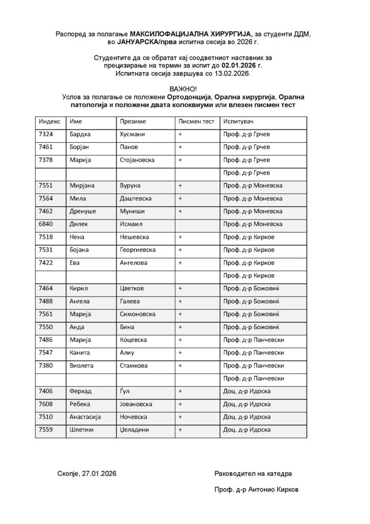КОРЕГИРАН Распоред за полагање МАКСИЛОФАЦИЈАЛНА ХИРУРГИЈА, за студенти ДДМ, во ЈАНУАРСКА/прва испитна сесија во 2026 г.