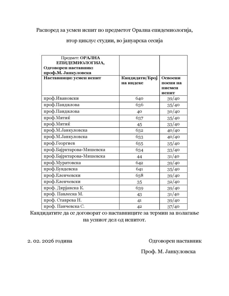 Распоред за усмен испит по предметот Орална епидемиологија, втор циклус студии, во јануарска сесија
