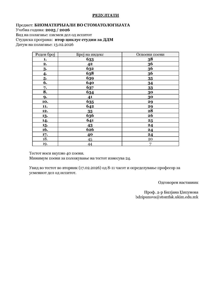 Резултати од полагање испит Биоматеријали во стом, втор циклус ДДМ, од 13.02.2026