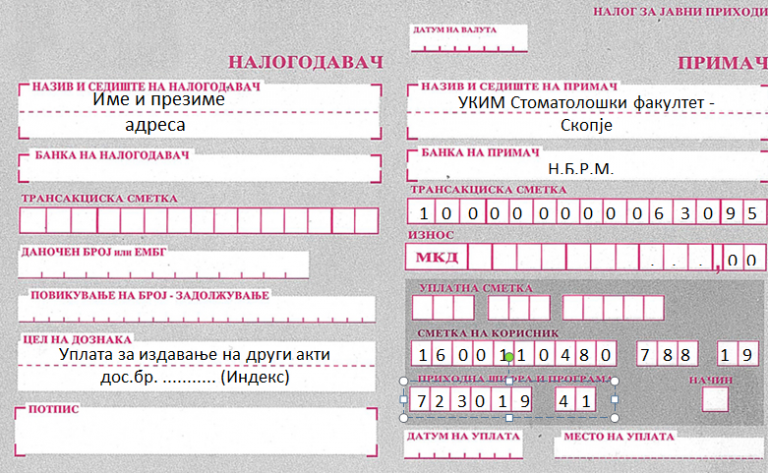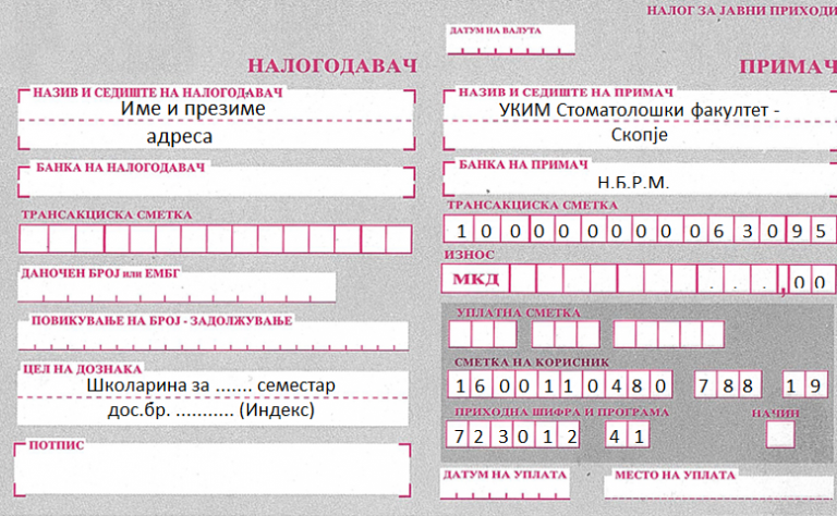 - Уплатница за школарина, сметка 100000000063095, сметка на буџетски корисник 160011048078819, приходна шифра 723012-41, курс на НБРМ.