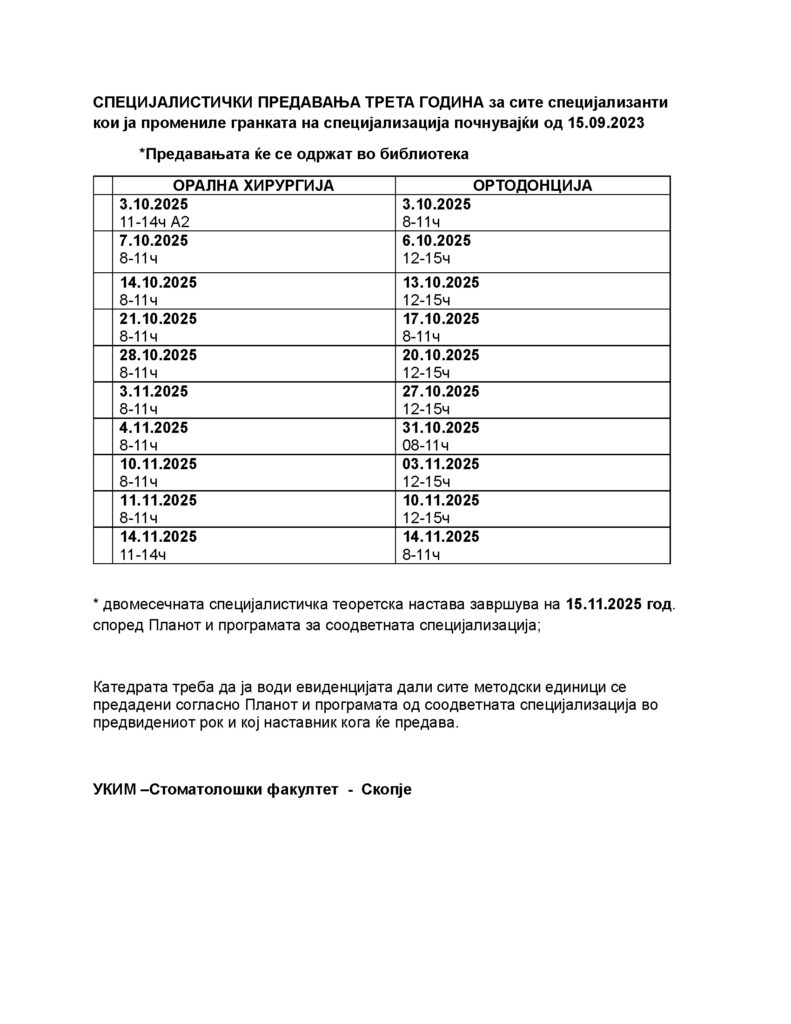 СПЕЦИЈАЛИСТИЧКИ ПРЕДАВАЊА ТРЕТА ГОДИНА за сите специјализанти кои ја промениле гранката на специјализација почнувајќи од 15.09.2023