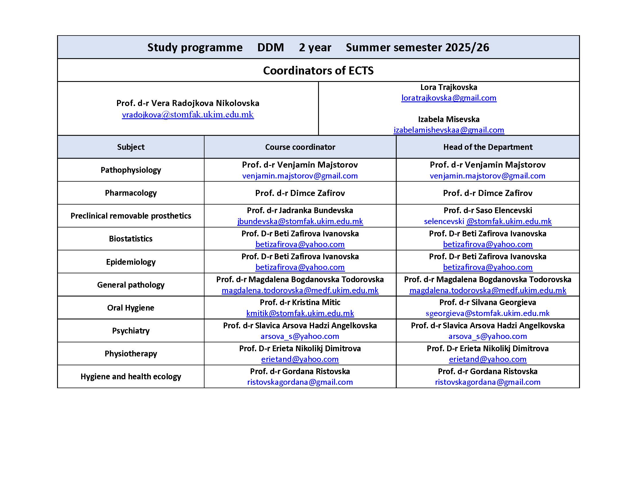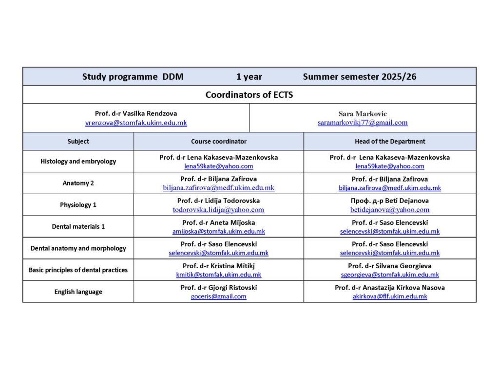 Coordinators of ECTS for Study programme DDM FIRST and SECOND year Summer semester 2025/26